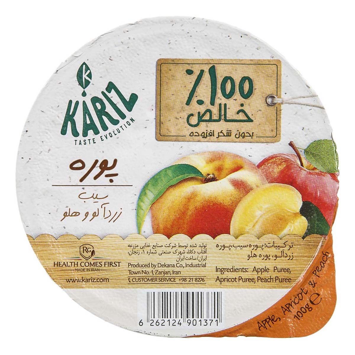 پوره مخلوط سیب و زردآلو و هلو ظرف پلیمری 100 g نام تجارتی کاریز مرجع عرضه کننده صنایع غذایی مزرعه آف